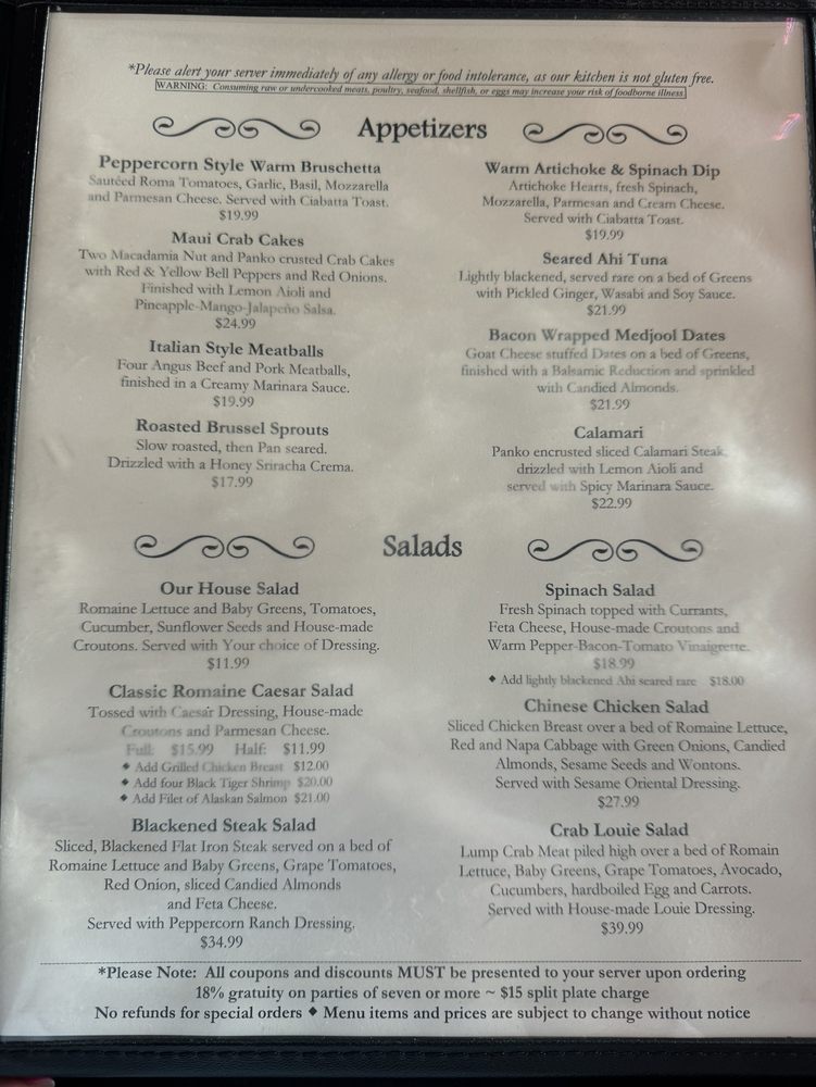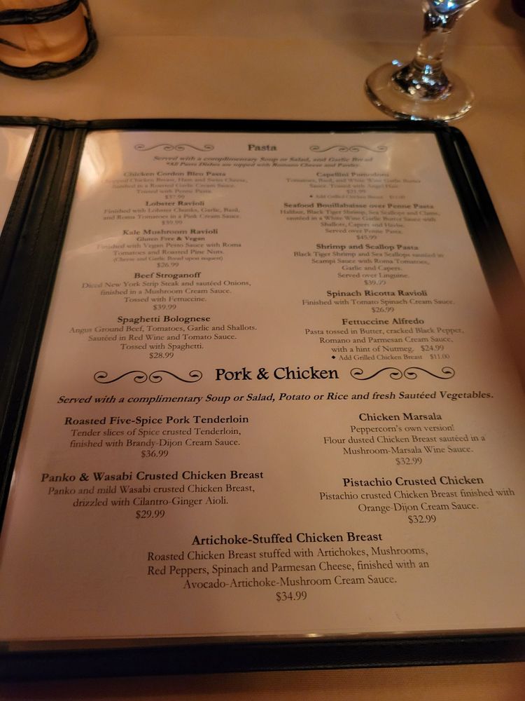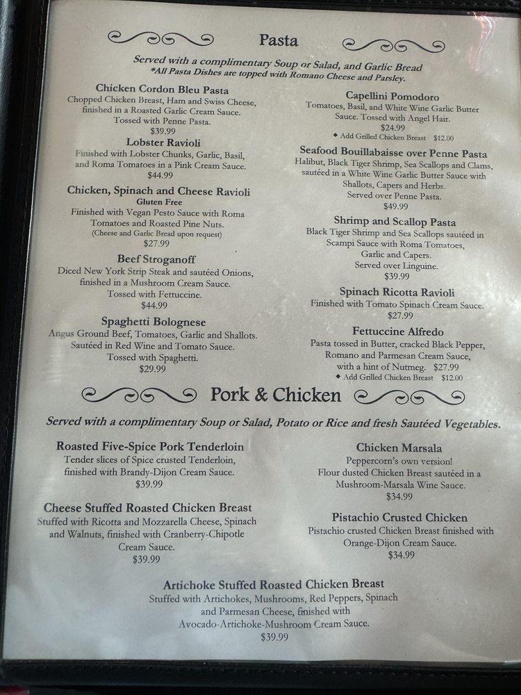 Peppercorn Grille, located in Big Bear Lake, CA, impresses with its diverse menu offering steaks, Italian dishes, and seafood. This restaurant not only caters to various dietary preferences with vegan and vegetarian options but also provides a classy yet casual dining experience. From warm bruschetta to Italian style meatballs, the appetizers are a flavorful start to any meal. The salads, like the Romaine Salad with Caesar dressing, are refreshing and well-balanced. The New England Clam Chowder soup is a comforting choice. Customers rave about the excellent service, friendly staff, and delicious dishes, particularly highlighting the perfectly cooked steaks, creamy mashed potatoes, and attentive waitstaff like Devin. Peppercorn Grille stands out as a top dining destination in Big Bear, offering a romantic ambiance and a memorable culinary experience.